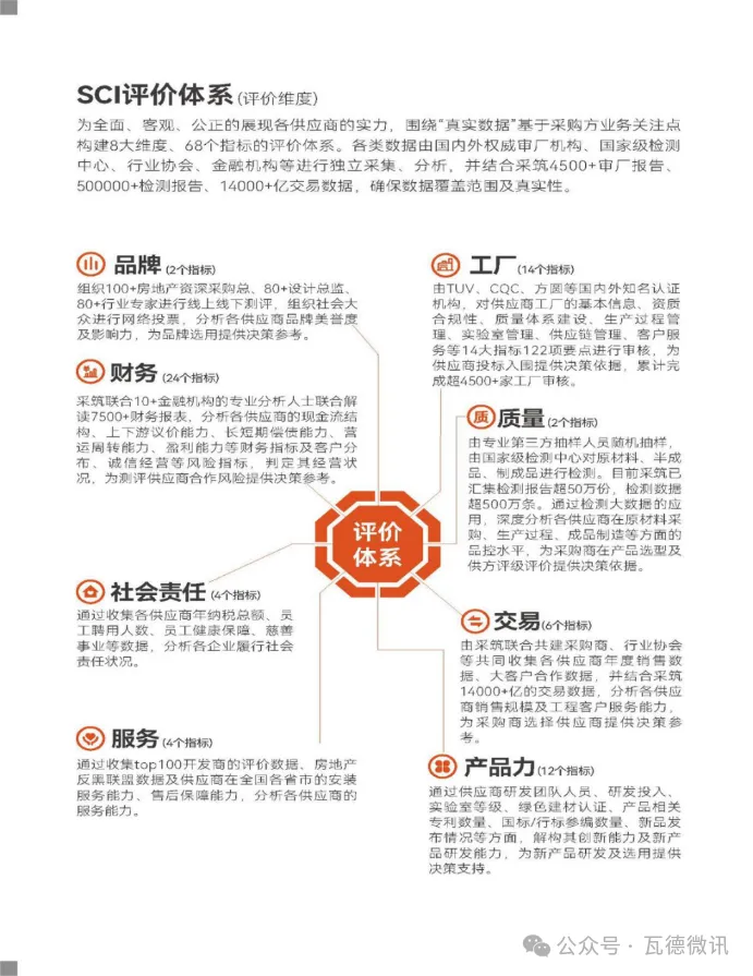 2024年,采筑供應(yīng)商綜合指數(shù)SCI全面升級:1、測評模型優(yōu)化:新增了政府平臺、國央企采購商關(guān)注的綠色工廠、綠色建材、綠色供應(yīng)鏈等測評指標;2、測評范圍擴大:本次測評涵蓋91個品類,2600多家供應(yīng)商參評,測評的供應(yīng)商數(shù)量增加50%,測評范圍也從供應(yīng)商擴展到與之相關(guān)的經(jīng)銷商、安裝商;3、升級并開放SCI智能測評系統(tǒng):可支持采購方自由選擇關(guān)注的指標及算分規(guī)則,為客戶提供根據(jù)自身需求定制的評估模型,快速生成評分;4、采信范圍擴大:采筑聯(lián)采資信標采信SCI測評得分,更多的采購商客戶通過采信SCI測評數(shù)據(jù)進行品牌庫建設(shè)。二、SCI三大特點:無濾鏡、無雜質(zhì)、無廣告SCI評價資料真實。測評資料來自房地產(chǎn)商、設(shè)計院、建筑單位、檢測機構(gòu)、金融機構(gòu)、供應(yīng)商、第三方數(shù)據(jù)平臺等渠道,覆蓋整個產(chǎn)業(yè)鏈。SCI基于評價模型對資料進行比對和甄別,提升資料的真實可靠性。SCI評價數(shù)據(jù)豐富。4500多份供應(yīng)商審廠報告、50萬余份產(chǎn)品檢測報告、7500余份財務(wù)報表,200多家共建單位線上線下專項測評、上萬大眾參與投票。采筑將SCI評價內(nèi)容與行業(yè)權(quán)威機構(gòu)的供應(yīng)鏈管理成果充分結(jié)合,輸出2024《采筑建材行業(yè)指南》,為行業(yè)提供一份客觀公正,能快速摸清產(chǎn)品力風向,全方位了解供應(yīng)商實力的供采合作指導(dǎo)工具書,輔助采購商客戶準確、快速決策,佐證供應(yīng)商綜合實力。